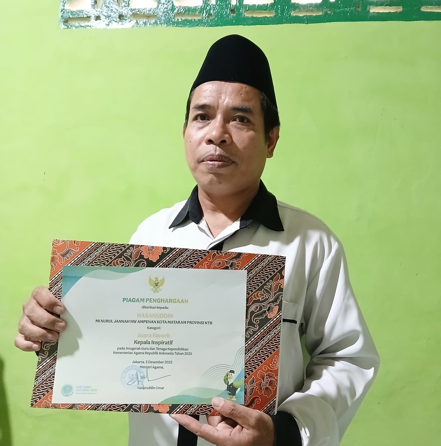 Editoriallombok.com, Mataram – Dipenghujung tahun 2025, Kepala Madrasah Ibtidaiyah Nurul Jannah NWDI Ampenan Hasanuddin kembali mengukir prestasi yang membanggakan. Ia menerima anugerah dari Kementerian Agama Republik Indonesia sebagai Kepala Madrasah Inspiratif Kategori Juara Favorit.